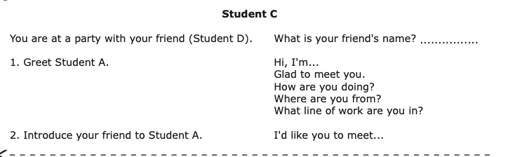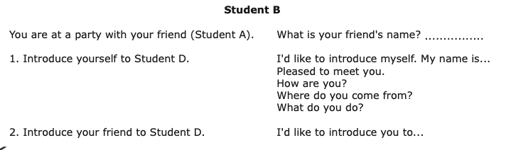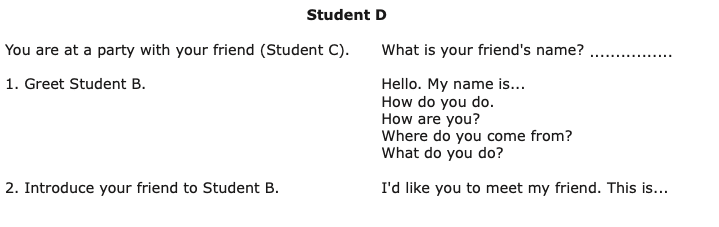 The teacher will give you an identity (student A, B, C, or D). Use this card to introduce yourself. Ask questions of your partner to learn information about them.